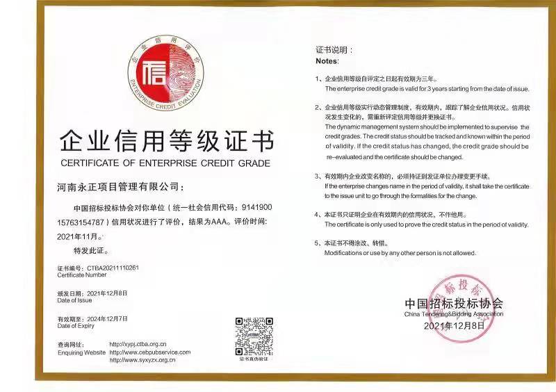 中国招标投标协会发布《中国招标投标协会招标代理机构2021年信用评价结果公告》,雷电竞网页版有限公司榜上有名,获得首次由中招协委托的第三方独立信用评价服务机构评价的招标代理机构企业信用AAA级证书。全国共有450家代理机构获AAA级,30家企业获AA级。河南有21家招标采购代理机构获AAA级,证书有效期三年。