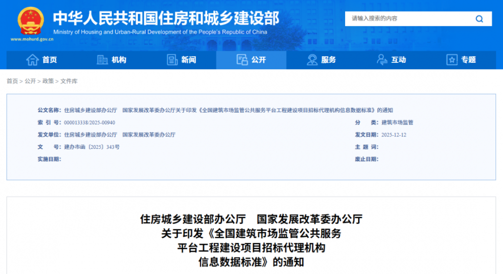 近日,住房城乡建设部办公厅、国家发展改革委办公厅发布关于印发《全国建筑市场监管公共服务平台工程建设项目招标代理机构信息数据标准》的通知,主要内容如下。
